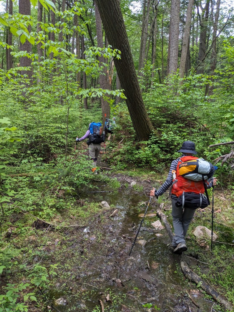 Soon after the lake, we hit the Ironstone Trail. Unsurprisingly, we did not glide through like the road walk. Much of the trail was overgrown and saturated with water, a mix of soupy mud and flowing water. There was a lot of careful footwork, hopping, and ducking. One botched attempt to get around a few downed trees sent us on a mini bushwhacking adventure to find the trail again.