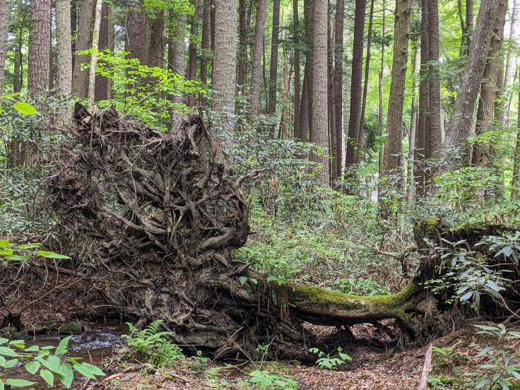 The Alan Seeger Natural Area lived up to the hype. This area is known for having one of the one of the few remaining groves of old-growth trees in Pennsylvania. The overflowing streams (Detweiller Run and Standing Stone Creek) and imposing rhododendron (Rhododendron maximum) made for interesting scenery. Studying the map afterwards, I would be interested to explore nearby areas, such as Bear Meadows.
