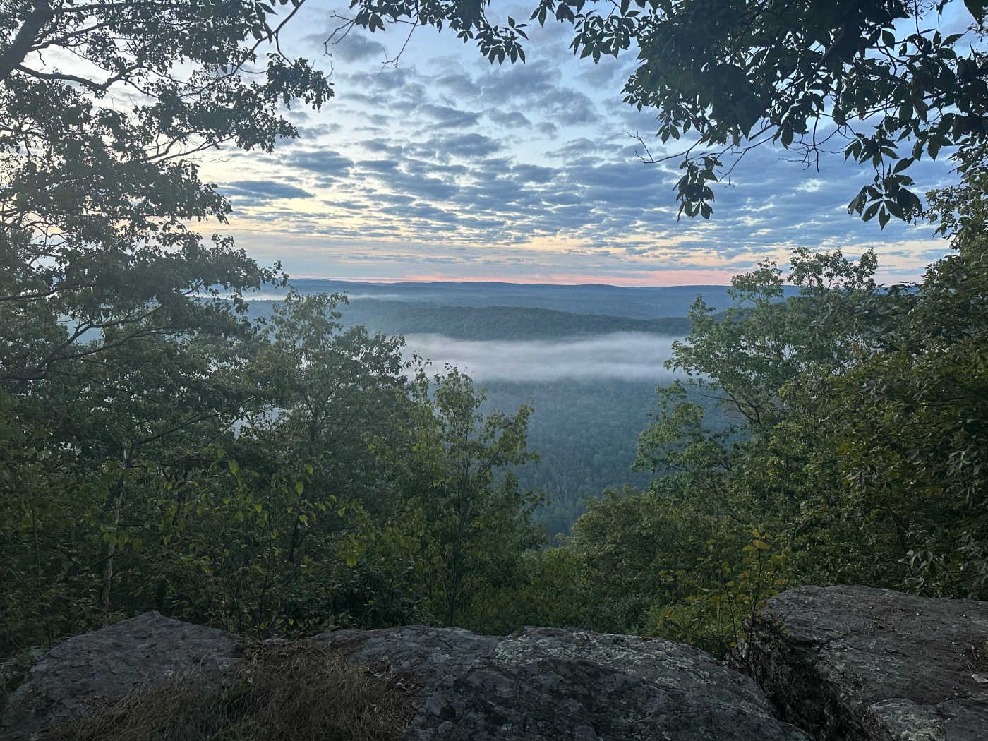 Blackwell has its limitations as a trail town. You can’t get a beer; you can’t get a meal; you can’t camp; you can’t get a room. I knew, once we left Big Run, we were doomed to have to climb back up to the plateau. Emily and Janice decided to stay at the nearby campsite maybe 1.6 km (1 mile) away. Reid, Logan, WB, Spider-Man and I chugged our way up the steep climb out of Blackwell. We collapsed at the top, where we enjoyed a truly beautiful campsite, which included both sunset and sunrise. We got a message from B~~~.