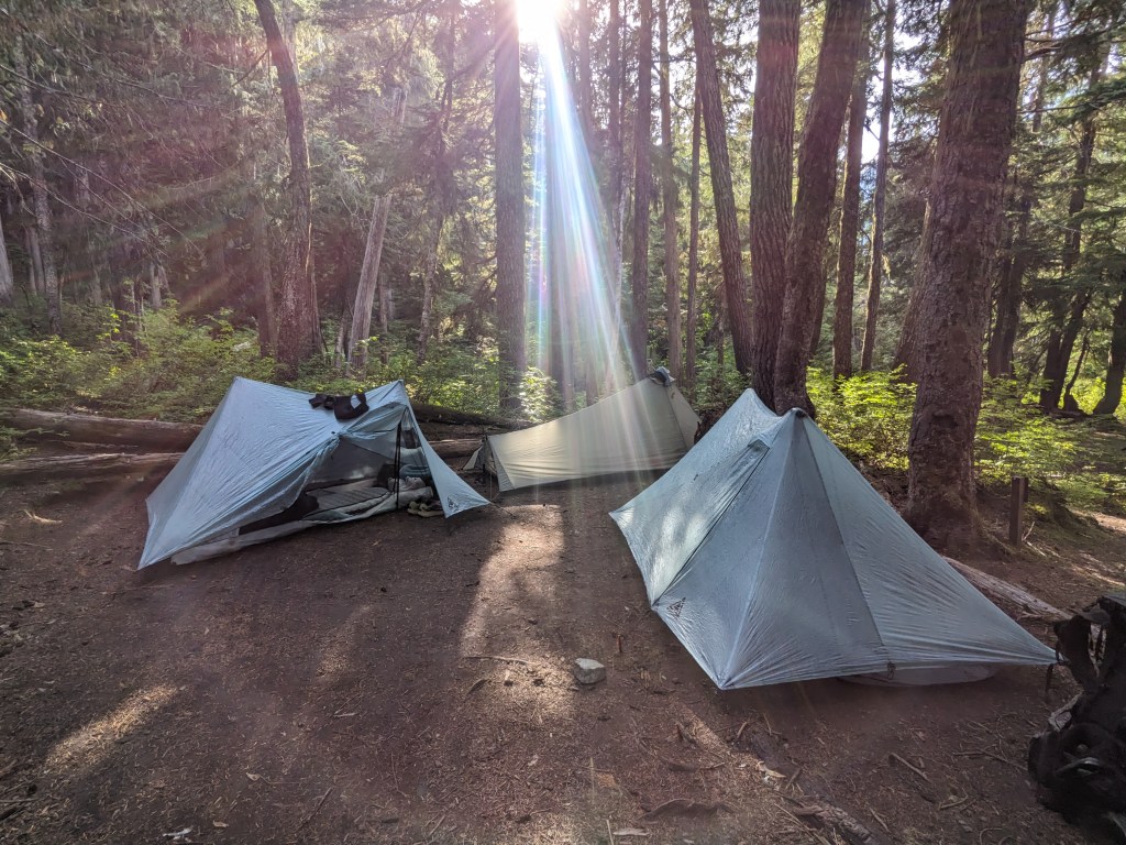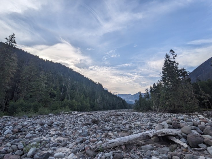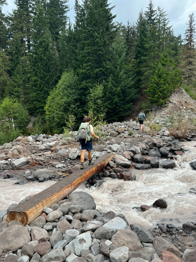 The trail started out in coniferous forest with giant trees and soft pine litter making for easy and pleasant trail conditions. We had our first water crossing at Kautz Creek, one of several streams and rivers along the trail formed by glacier melt. Some of these had permanent bridges, others required navigating stream beds. Frequent flooding reshapes the landscape, and new log bridges and stone markings are thrown down to show the way. Fording these crossings is one of the main hiking hazards, but we were pleased to find that this wasn’t necessary on this trip. Mostly we got turned around at these crossing, as the trail is easy to lose and our CalTopo didn’t reflect updated routes. We arrived at Pyramid Creek just before sunset. Our campsite, as expected, was just big enough for our tents and this trend would continue at the other sites.