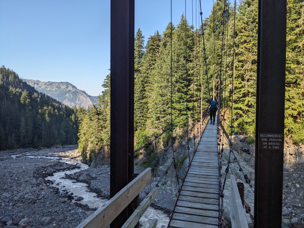 The morning featured multiple river crossings followed by glacier views. First was Carbon River, crossed by another suspension bridge. The Carbon Glacier was massive and clearly formed the raging river below. A jaunt through more idyllic blueberry-filled parks (Moraine Park) and mountain lakes (Mystic Lakes) lead to another river + glacier combo around Winthrop and Granite Creek.