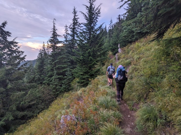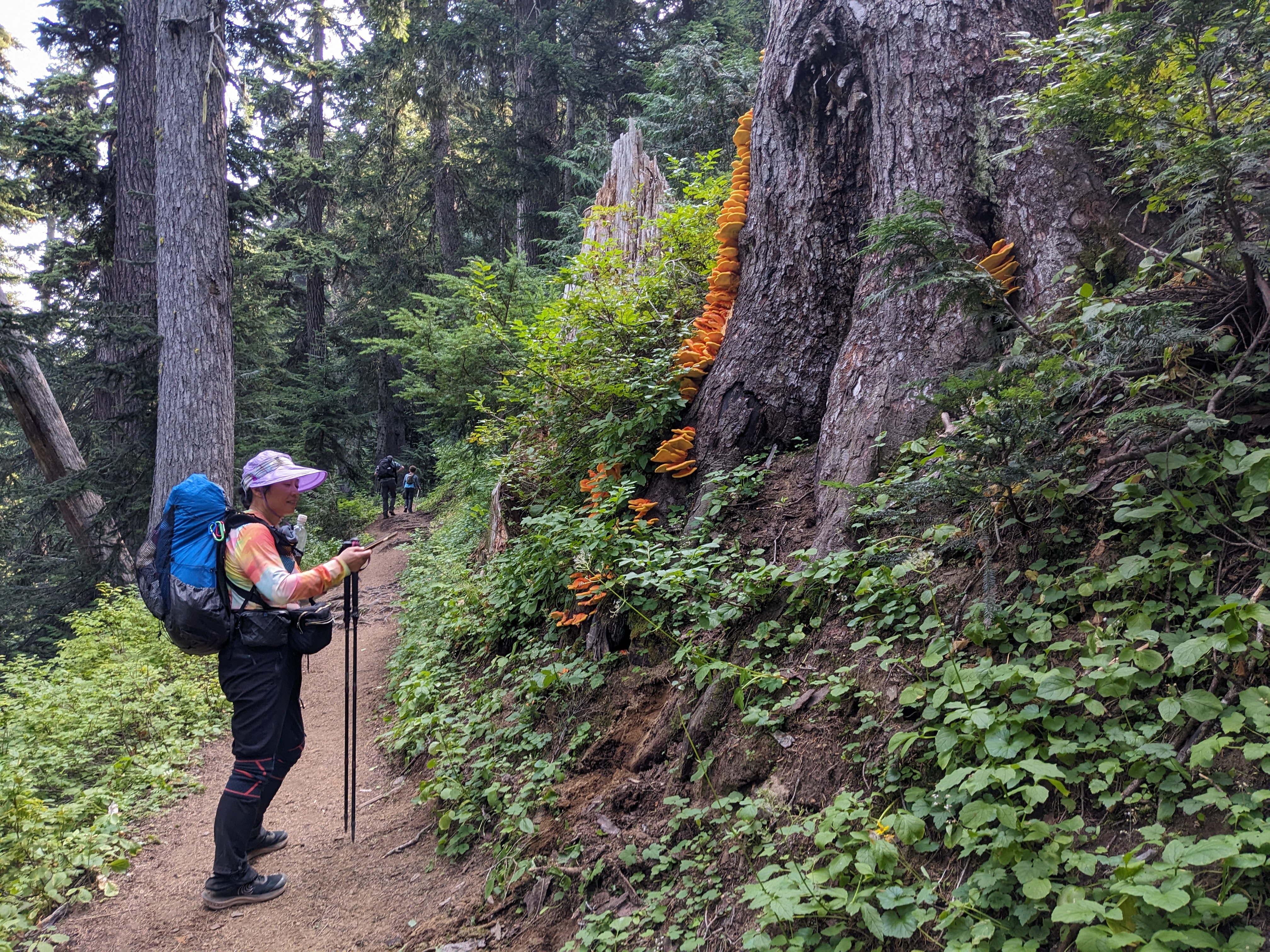 At 21 mi and 7150 feet of gain, our first full day would be our most difficult. We were off before sunrise and continued to hike up through the old-growth forest. The giant old trees, along with the moss and fern covered understory, left us feeling like it was an ancient and venerable place. Fallen trees had rootballs that were twice as tall as us and there were mushrooms as big as our heads. The woodland critters included squirrels and grouse. Lily was a big fan of the mushrooms and stopped frequently to admire them.