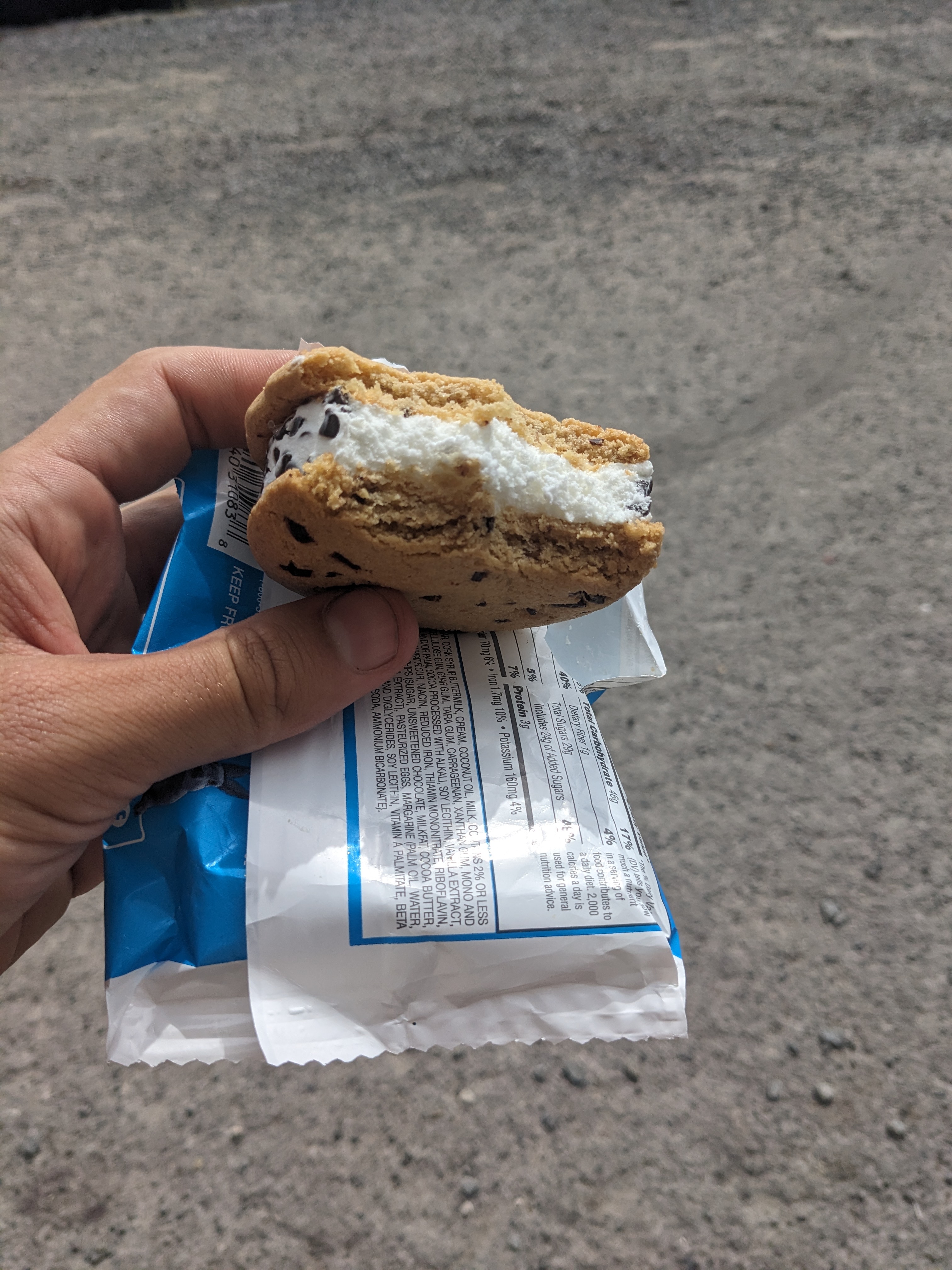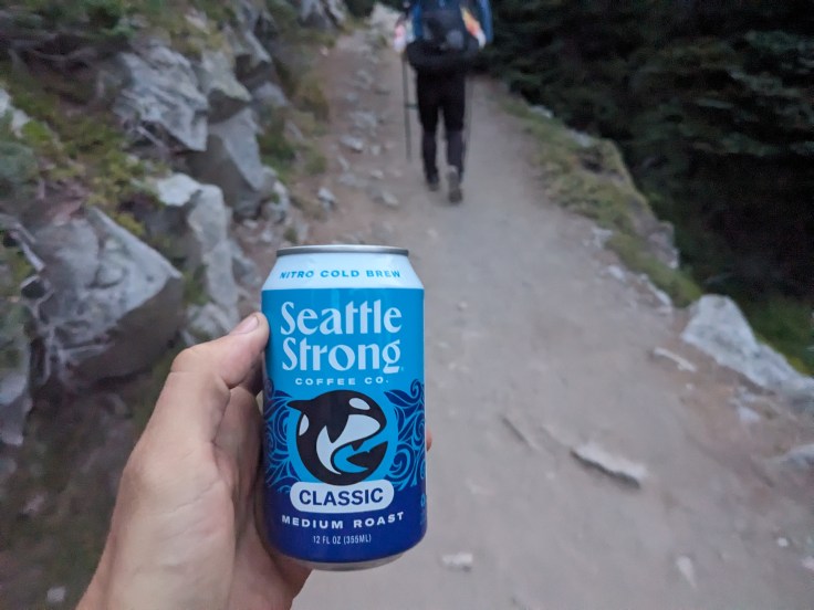 In the open area towards Sunrise, there were first mountain goats and then later day hikers. I power-hiked past the crowds on the Sourdough shortcut. Meanwhile, Brian was stopping by our campsite to claim a spot. Once I finally made it, I was impressed with the snack bar’s options. My haul included one hot dog, two beers, one ice cream sandwich, and one cold brew. I caught up with Brian and we enjoyed our goods while watching folks come and go to their cars. Not everything was a winner; Brian thought the beer was so bad he gave the rest away to some thankful hikers next to us.