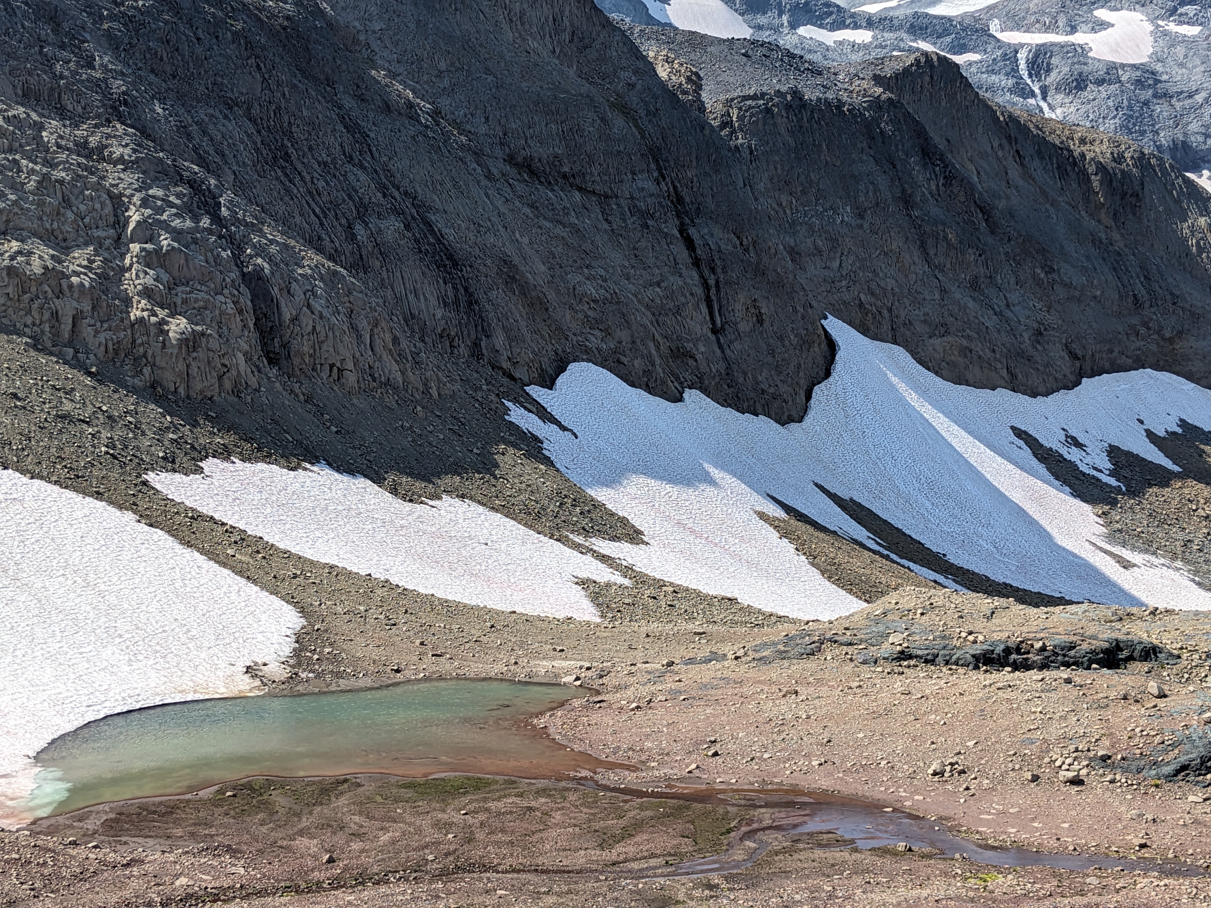 Here was a harsh and beautiful landscape with red and green tinted rocks, lingering snow fields, waterfalls, and blue ponds. Among the rocks were snow-fed streams with cool plants, with many having flowers in bloom. Once we got up to Panhandle Gap, we could survey the scenes below and gawk. This, I’ve decided, was my favorite section of the trail. Excuse me while I show way too many photos.