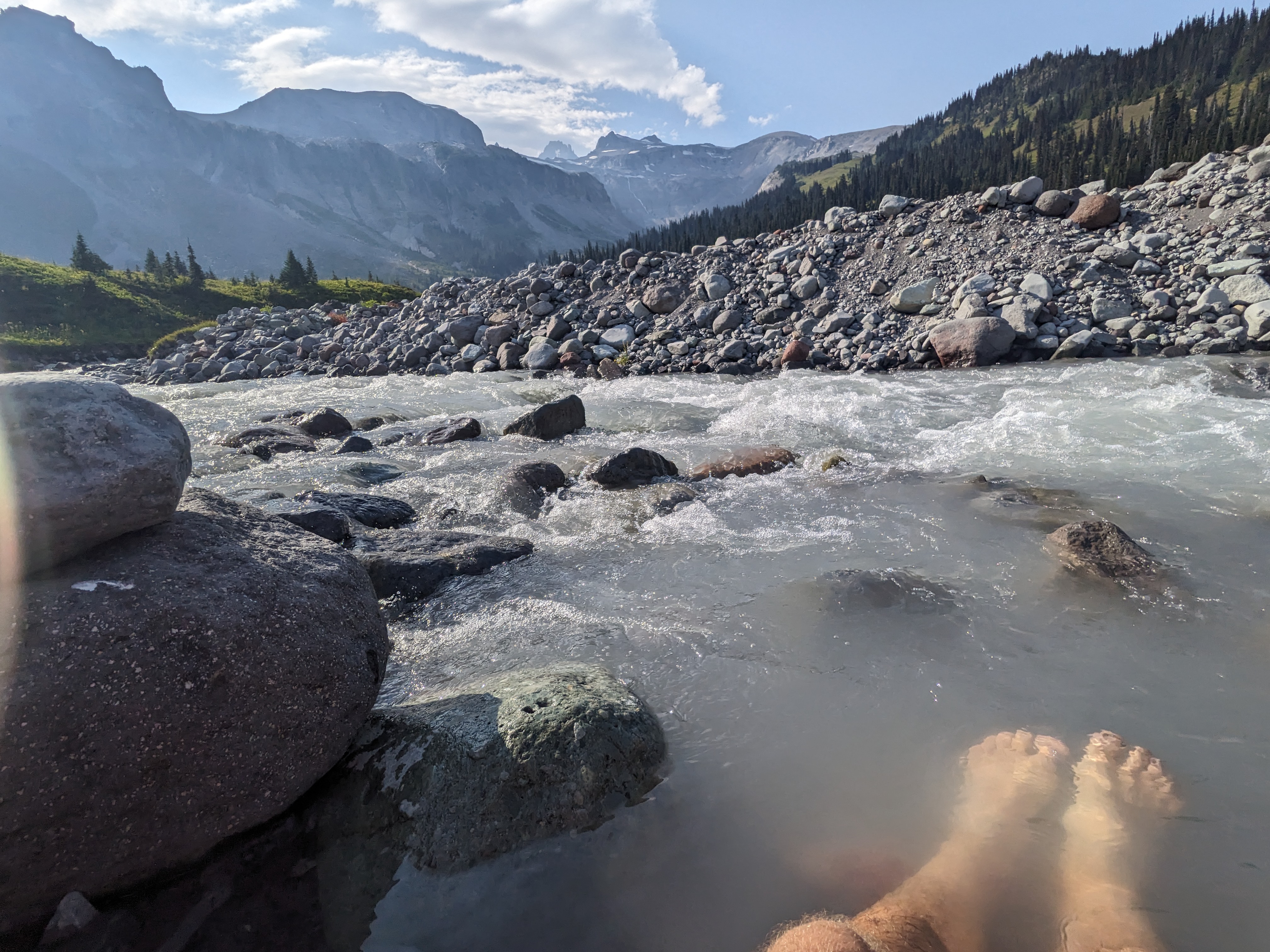 Our last campsite was Indian Bar, one of the best on the trail. There are views of meadows and the Ohanapecosh River nestled among the mountains. We admired the scenery from the group shelter for awhile where we chatted with other hikers. I sat by river for a bit and plunged my sore feet into the ice cold water.