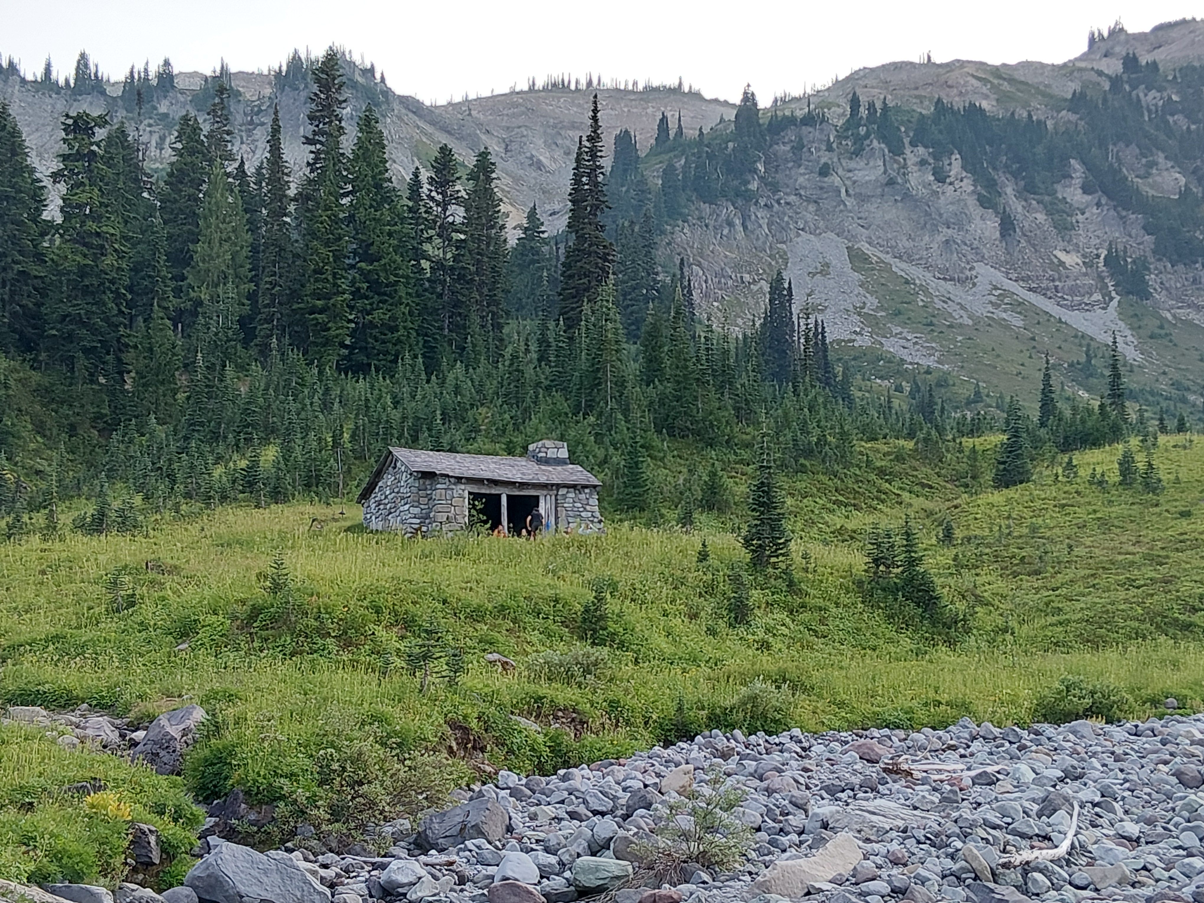 We were hiking the loop clockwise starting at Longmire. First we drove to White River Campground to pick-up permits and drop off a food cache. We were able to secure walk-in permits for Pyramid Creek that night and, more exciting, for Indian Bar on the last night. The rangers also gave us some good tips. We learned about some dry sections and that bugs (mosquitoes, biting flies) wouldn’t be an issue. They pointed us to where we could get extra fuel left behind by other hikers, as we didn’t have any luck finding smaller 4-oz ones on the drive up. We would encounter more rangers on the trail, as they had patrol cabins along the trail.