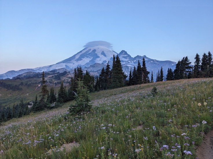 Our last day would be a long 20 miles. There was some angst about getting back to the car early enough to have time for dinner and catch our flights. So we left at sunrise and caught one last awesome view of Mount Rainier among a meadow of purple sunflowers. This is the Type 5 Wonder, the mountain. This is one big mountain. We see mountains all over the place, but some mountains just stand out and evoke awe.
