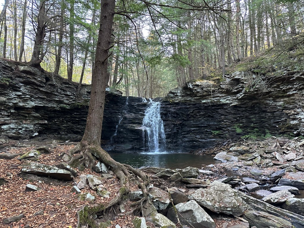 We headed out in the late afternoon. After a little road walking, we reached Tioga State Forest and enjoyed great hiking in the dusk. Our headlamps had not been on for very long when we reached Sand Run Falls, which I had billed as one of the best campsites on the east coast. People were not disappointed as they lowered themselves down into the bowl. It was a cold night (high 30s) and we were impressed by how long Chet stayed in shorts and a t-shirt. B~~~ had to fight off a raccoon during the night.