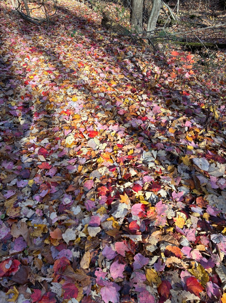 At that point I hadn’t needed my winter gear. The temperatures were in the 70s and I was hiking in my sun shirt. I should have taken off my long pants but didn’t for some reason. It was a beautiful day. The bright fallen autumn leaves carpeted the trail like an oriental rug.