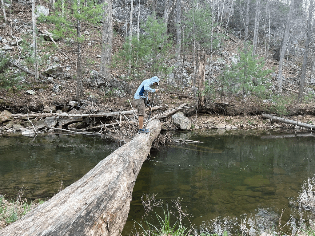 I bought a Tenkara rod thinking that somehow my luck catching fish would improve. $120 down the drain. Frosty and I walked downstream for at least 1/4 of a mile looking for trout but we were seeing and getting nothing. Frosty hypothesized that the warm temperatures of the area just isn’t conducive to a healthy brook trout population. Instead of fish I found some good onion grass. I will say that Tenkara rods are great for backpacking. My rod weighs only 2.8 oz and packs down to the size of a folded down trekking pole.